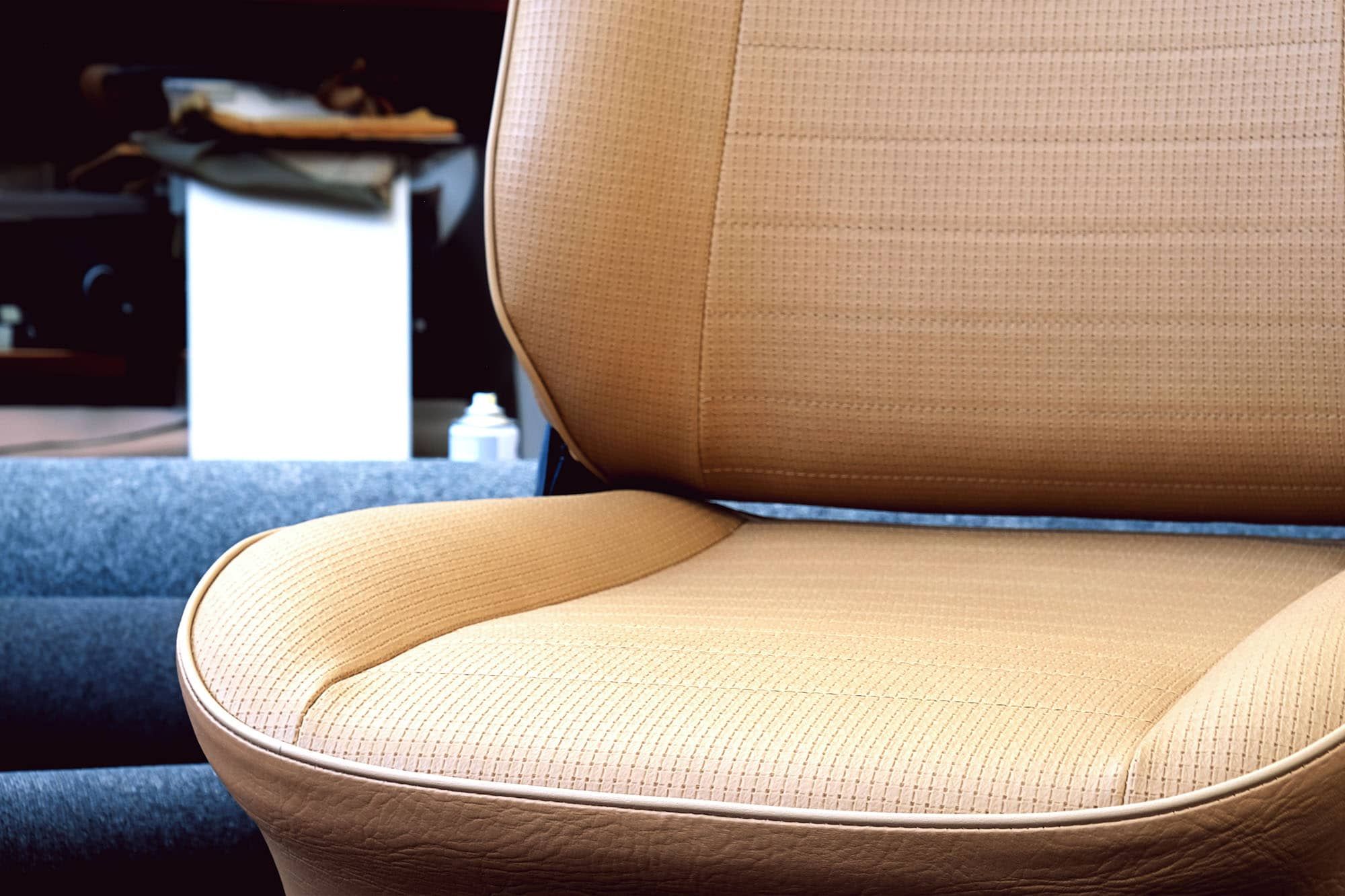 Originalgetreue Sitzbezüge für den VW Käfer 1303 ab Baujahr 08/1976. Außerdem passend für Dreibeinaufnahme-Sitze (z.B. mexikanische Modelle) mit herausnehmbarer Kopfstütze.